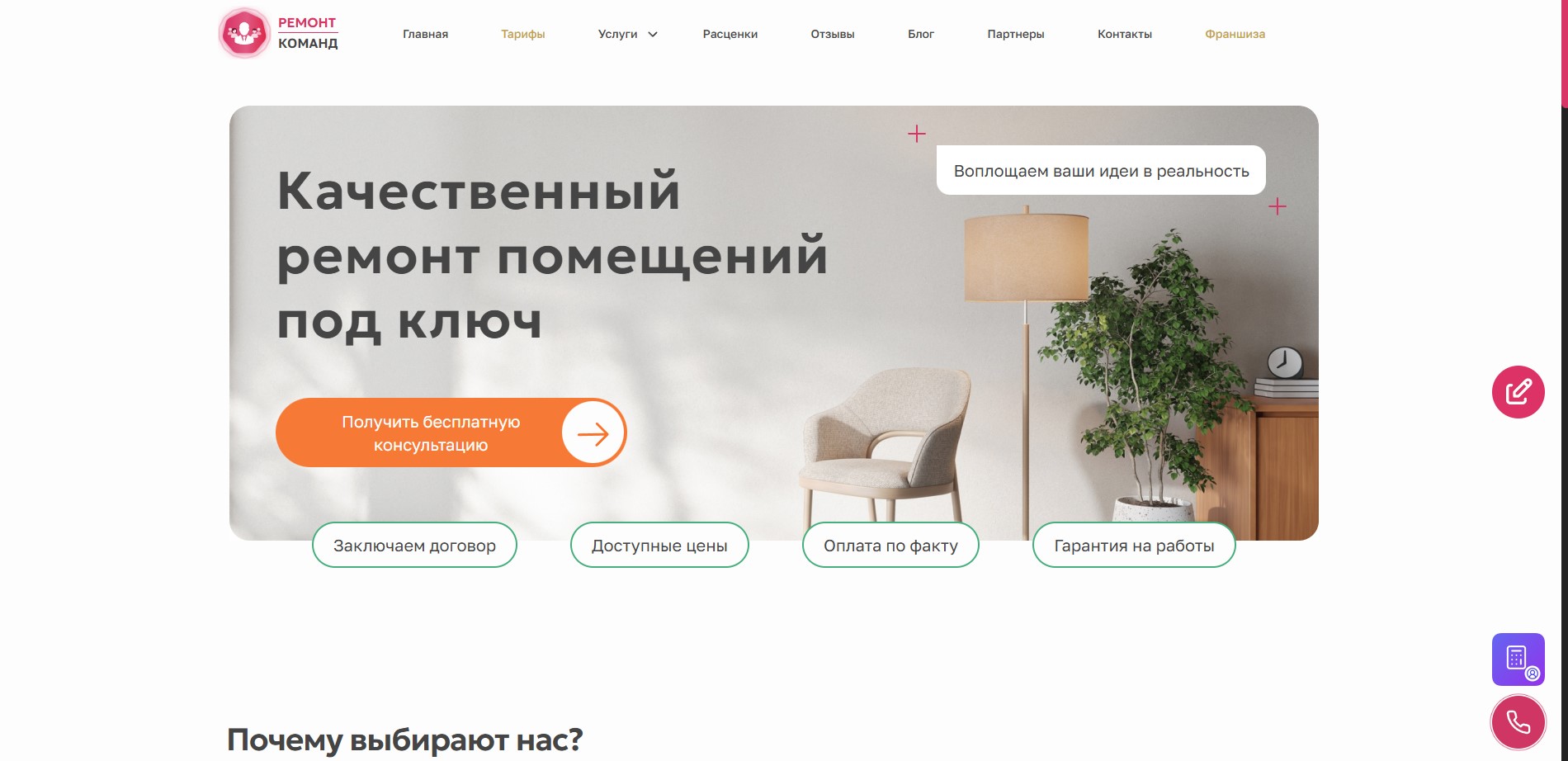 Сайт для компании которая занимается ремонтом квартир и помещений. Разделы: услуги, блог, расценки, франшиза, галерея. Квизы и калькуляторы. Админка для управления контентом.